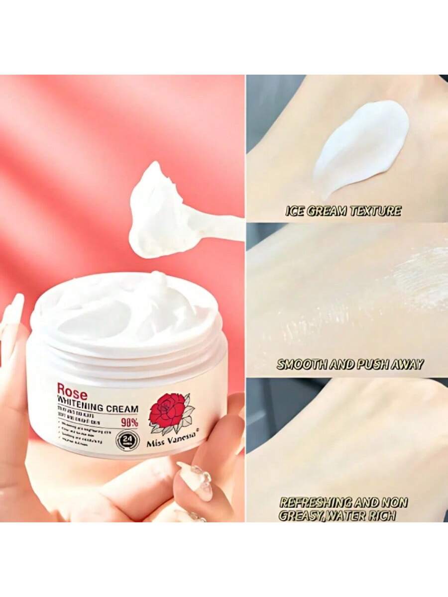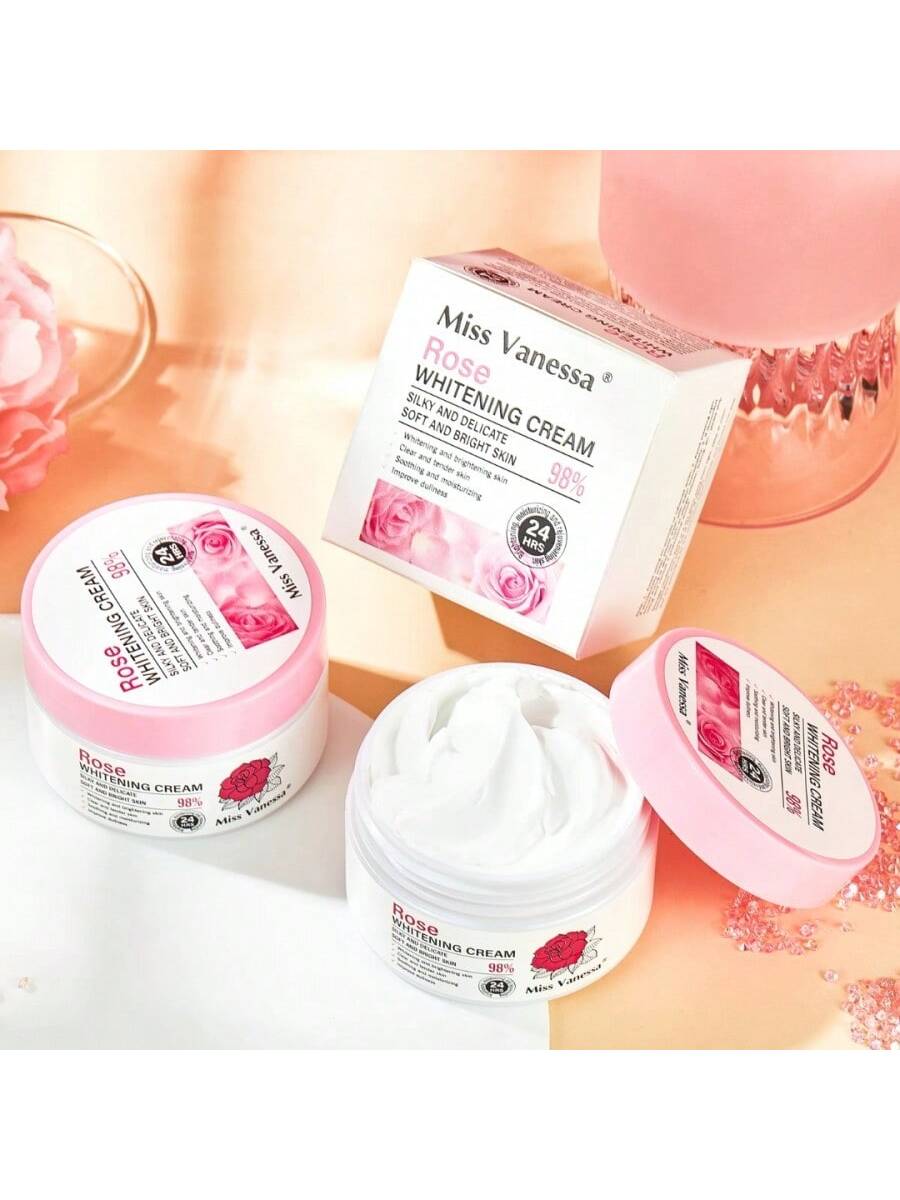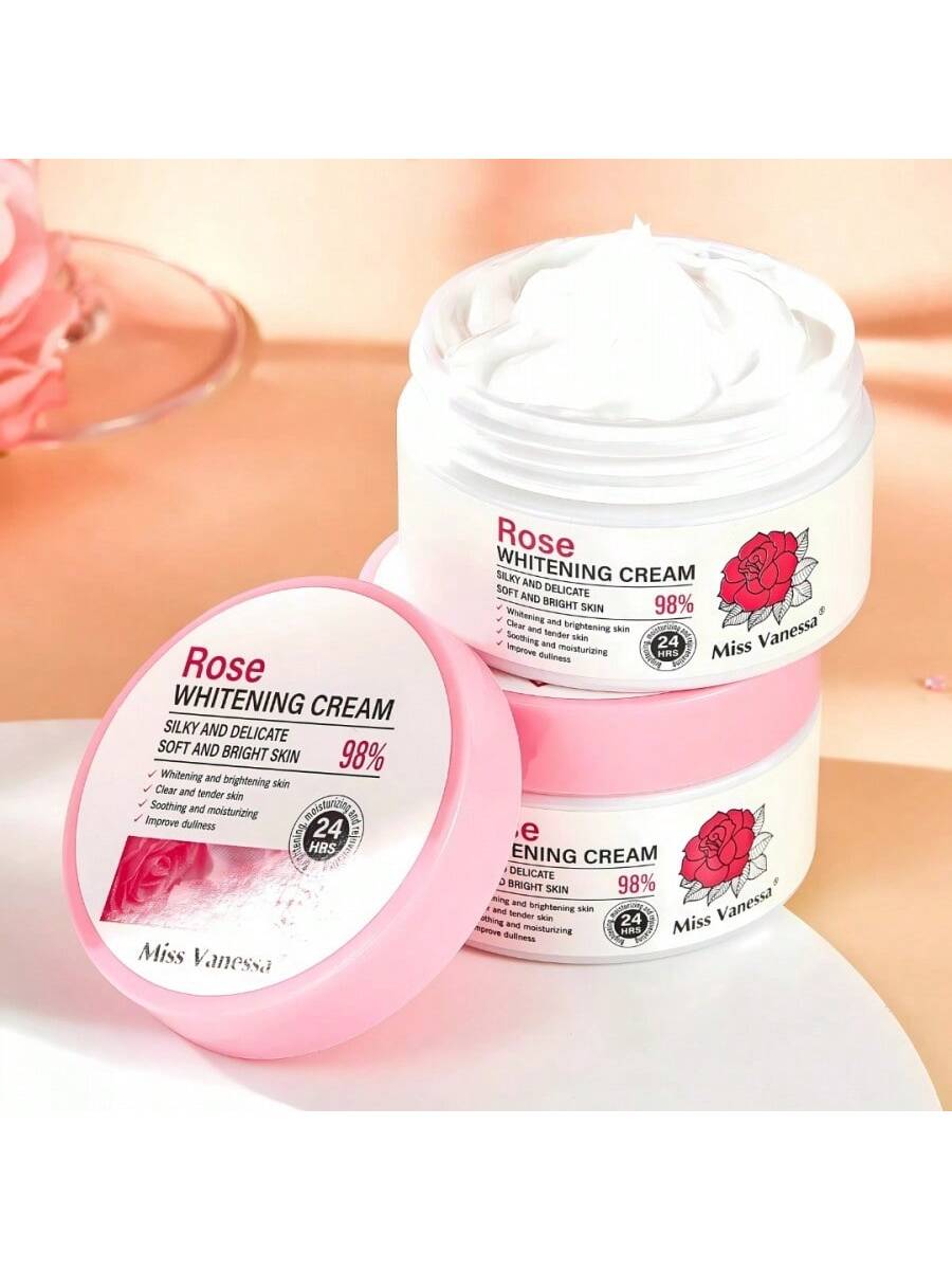 Crema blanqueadora de rosas 120 ml - Enriquecida con extracto de rosas, esta crema combina propiedades iluminadoras con un aroma floral relajante. Nutre la piel mientras trabaja progresivamente para lograr un tono más uniforme. Apta para todo tipo de pieles.