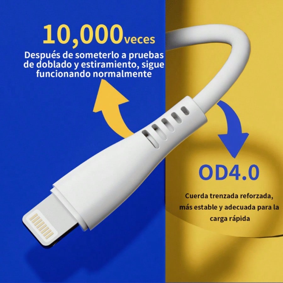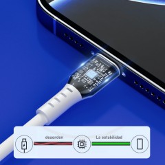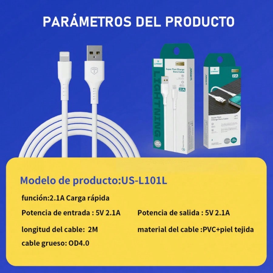 Este cable de tipo USB to Lightning soporta una potencia de carga de 2.1A. Sus 4 núcleos internos facilitan una velocidad de transferencia de datos de 480 Mbps. Con 1 metro de longitud y material PVC, ofrece compatibilidad y funcionalidad.