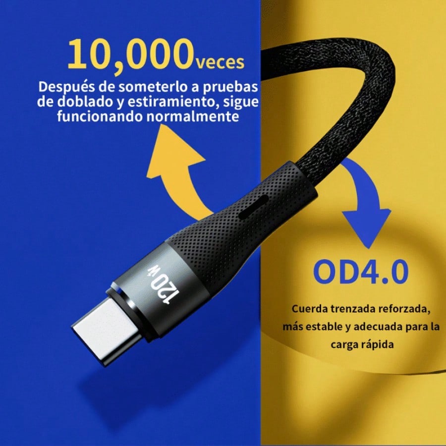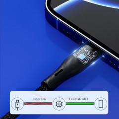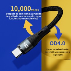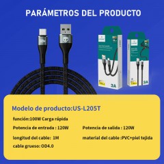 Cable de tipo USB to Tipo C con una potencia de carga de 3A. Cuenta con 4 núcleos internos y velocidad de transferencia de 480 Mbps. De 1 metro de largo y material PVC+Nailon Trenzado, está hecho para un uso exigente.
