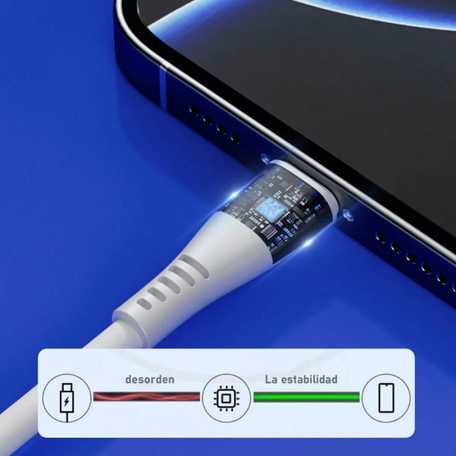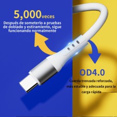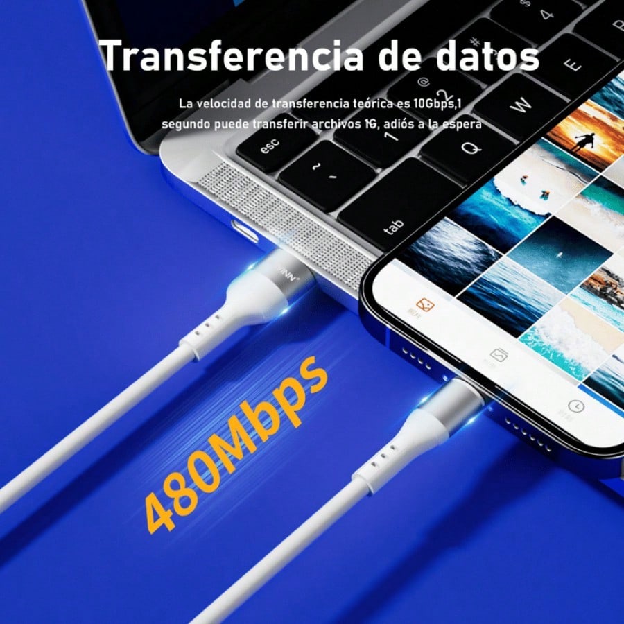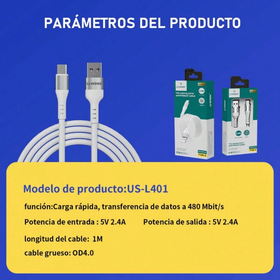 Cable USB to Tipo C en color blanco, con potencia de carga de 2.4A. Integra 4 hilos internos para transferencias de datos de 480 Mbps. De 1 metro de largo y fabricado en PVC, es ideal para dispositivos actuales.