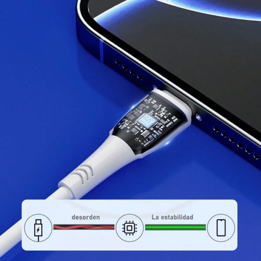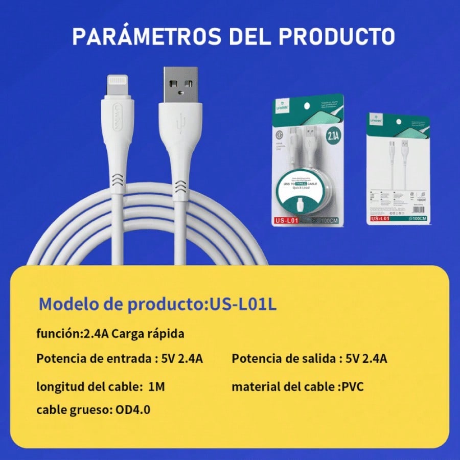 Cable de tipo USB to Lightning que soporta una potencia de carga de 2.4A. Integra 4 núcleos internos para transferencias de datos de 480 Mbps. Con 1 metro de largo y material PVC, es un accesorio funcional y confiable.