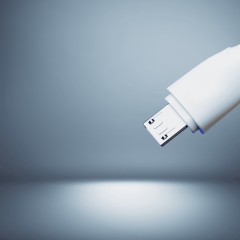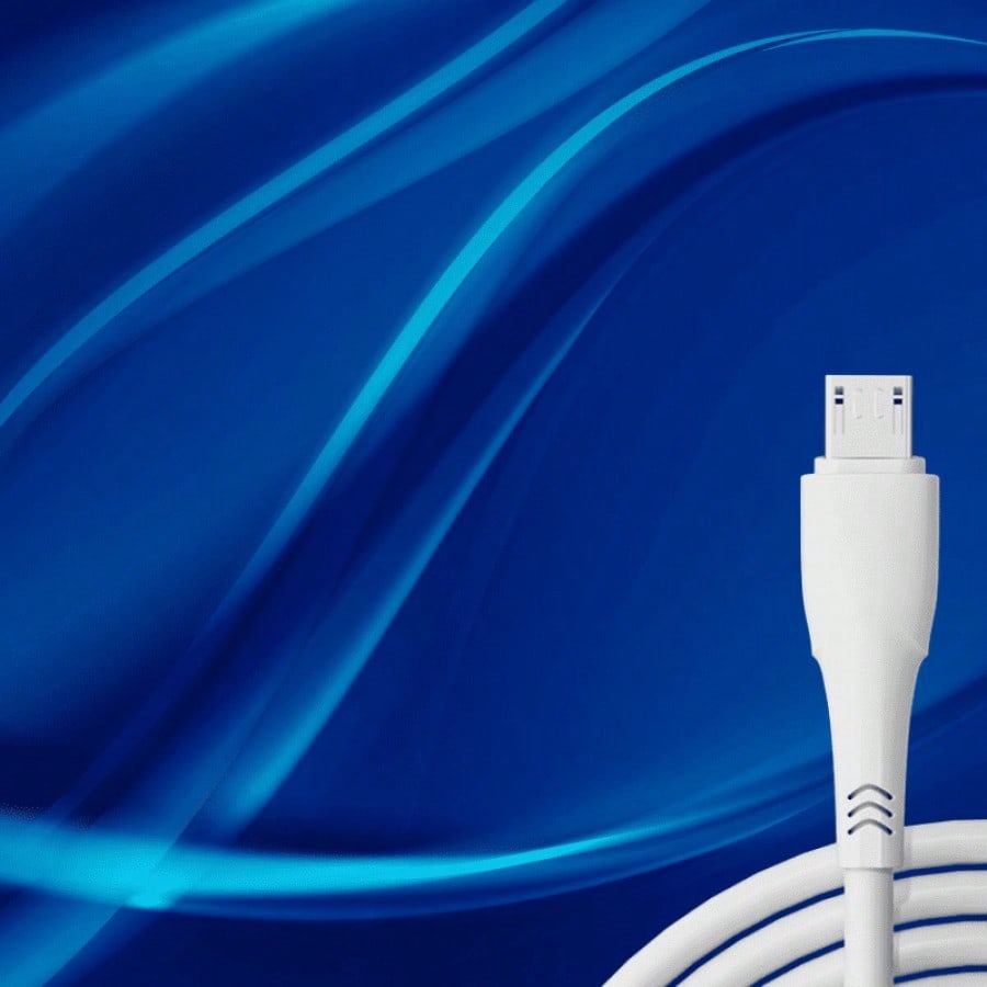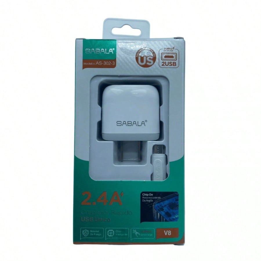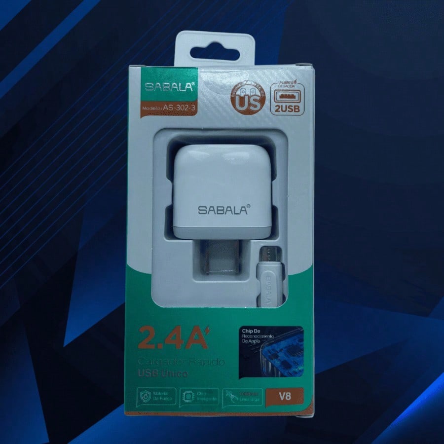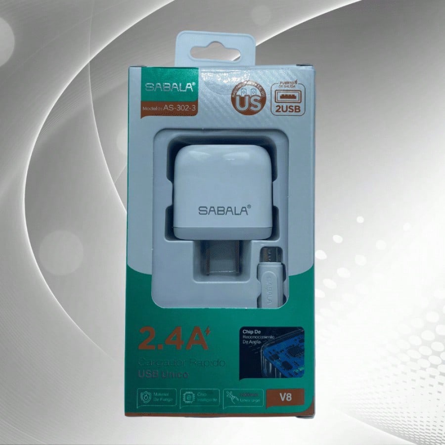 Cabezal de carga con cable V8 de 15W y doble entrada USB en color blanco. Ofrece una solución completa para cargar múltiples dispositivos con eficiencia y un diseño organizado.
