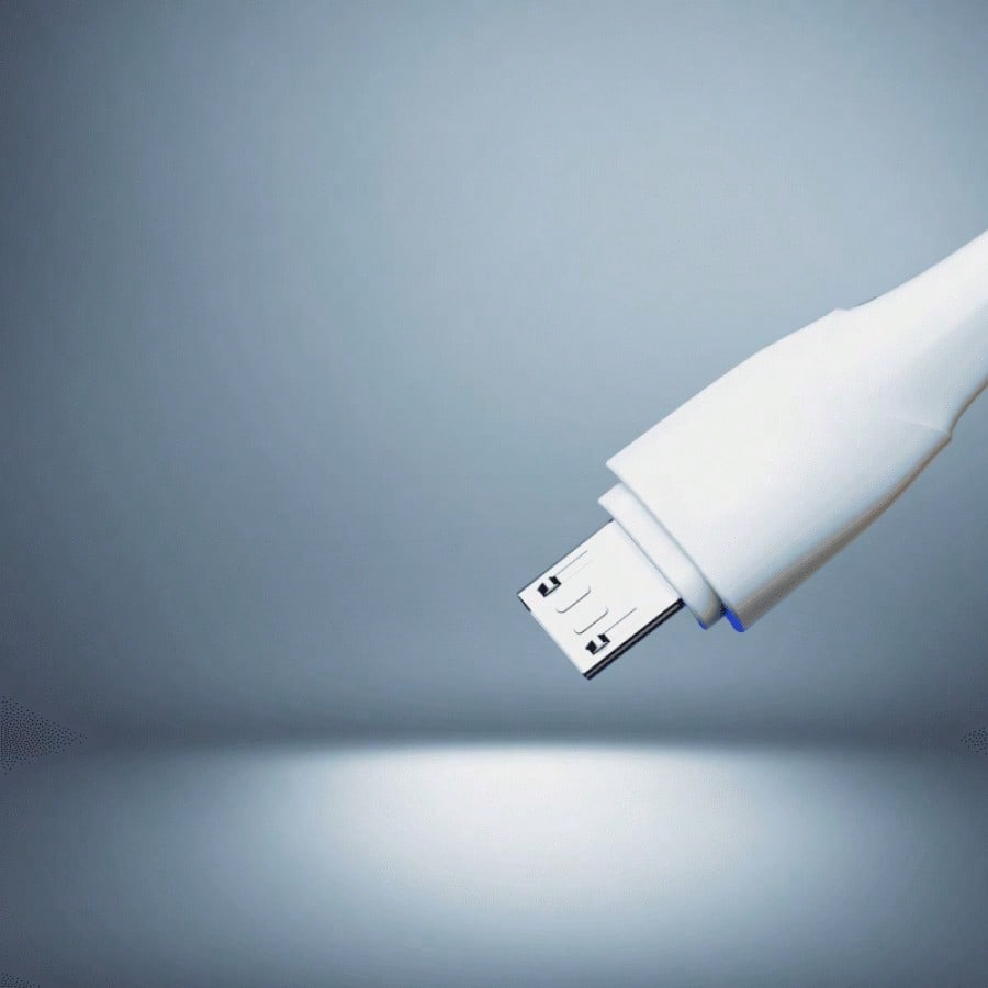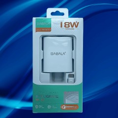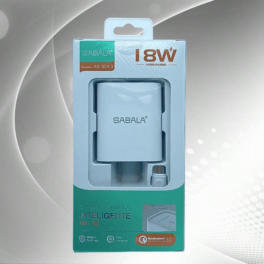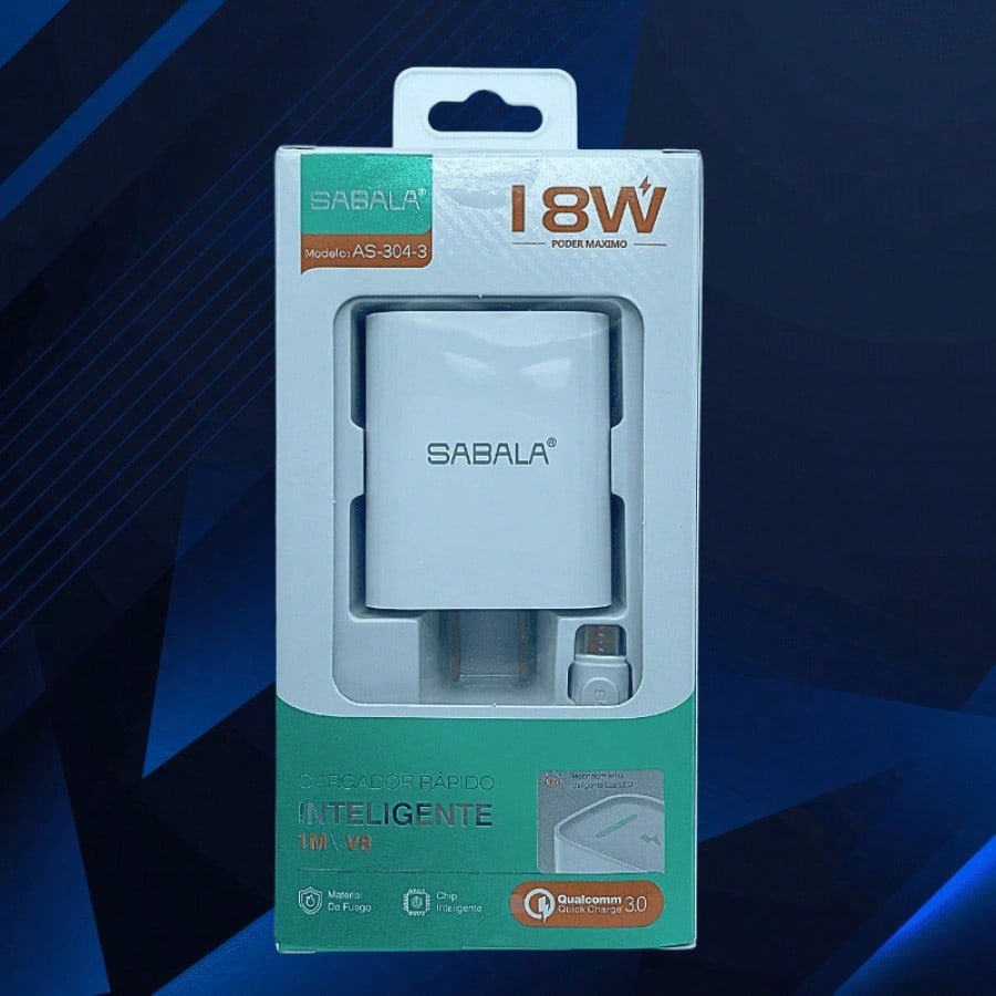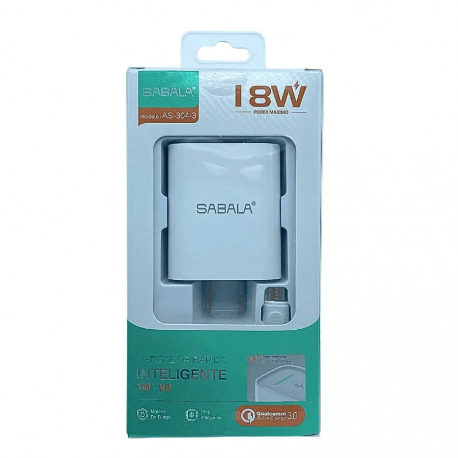 Cabezal de carga con cable V8 de 18W en blanco. Ofrece un rendimiento equilibrado y confiable para la carga de dispositivos, con un diseño específico que busca eficiencia y durabilidad.
