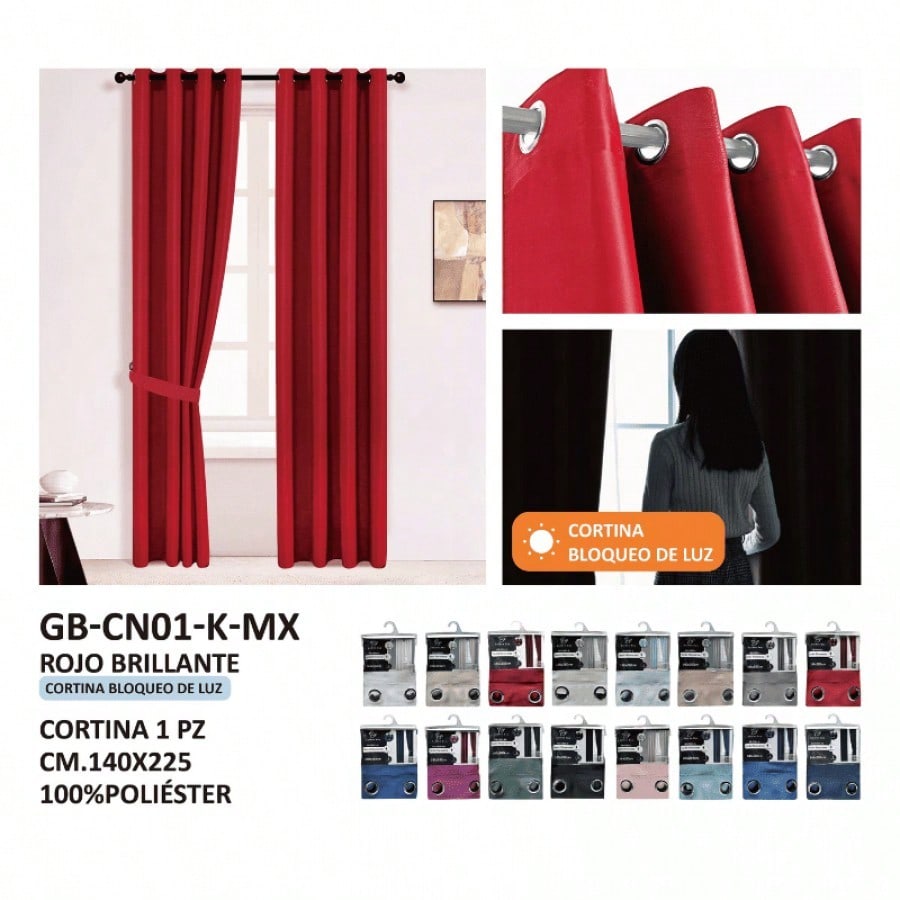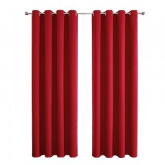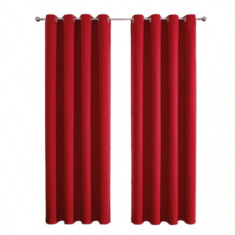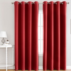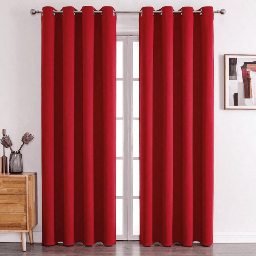 Cortinas rojas con estilo moderno y sistema de ollaos para fácil instalación. Color vibrante que aporta energía y personalidad a la habitación, combinando funcionalidad en el control de luz con un impacto visual notable.