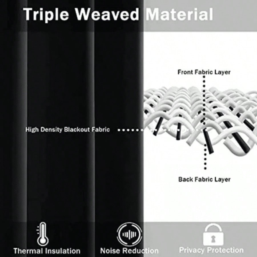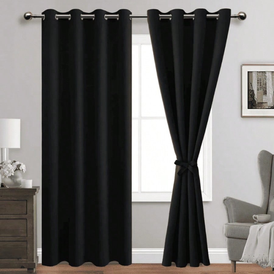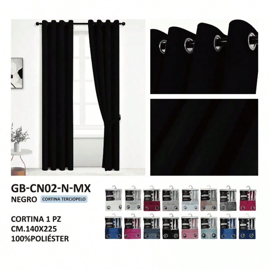 Cortinas negras con diseño moderno y sistema de ollaos para barra. Color sofisticado que proporciona máximo control lumínico y privacidad, ideal para estancias que requieren oscuridad total.