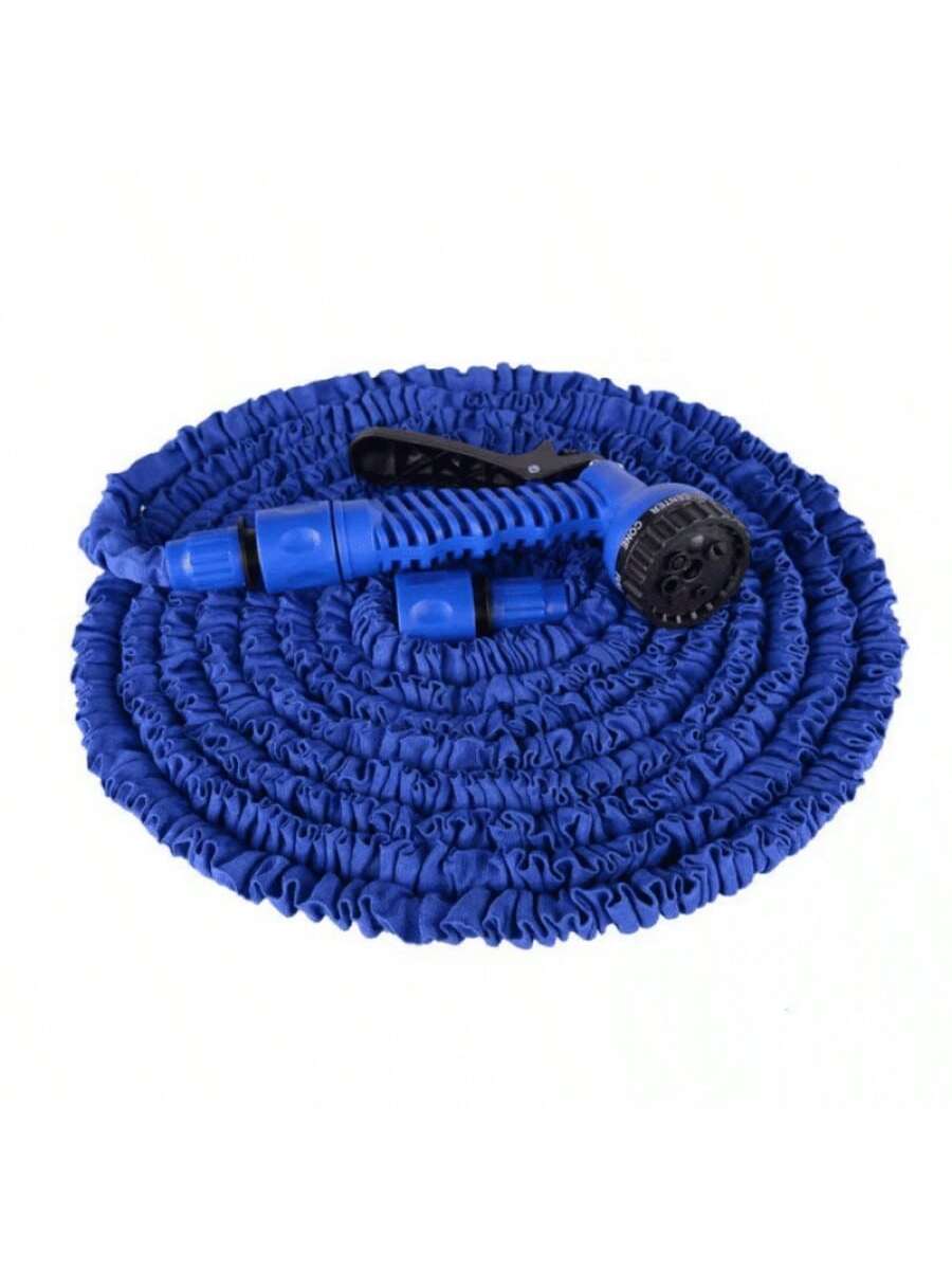 Cabezal de pistola de agua azul con siete funciones y alcance de 75 pies. Diseño compacto que ofrece múltiples patrones de agua, ideal para riego y limpieza en exteriores.