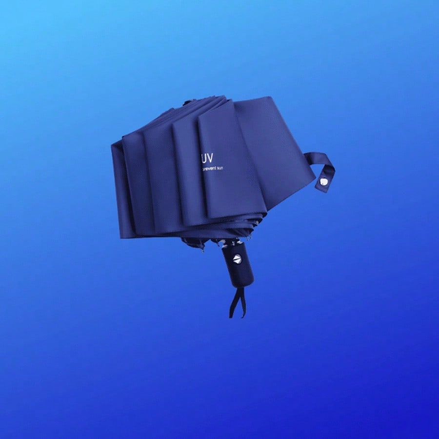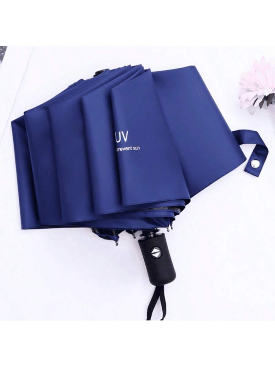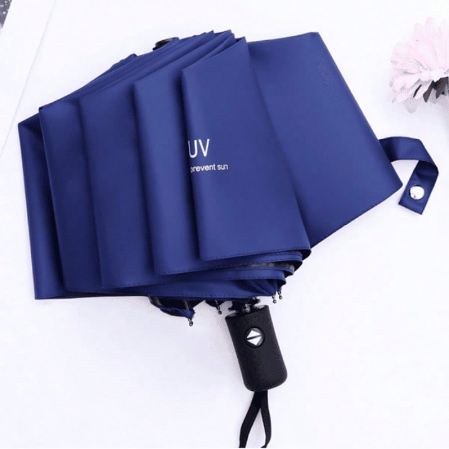 Protégete del sol y la lluvia con este paraguas plegable de color azul marino. Con factor de protección UV y apertura automática, es un accesorio práctico y esencial para cuidarte durante tus paseos diarios o en tus viajes.