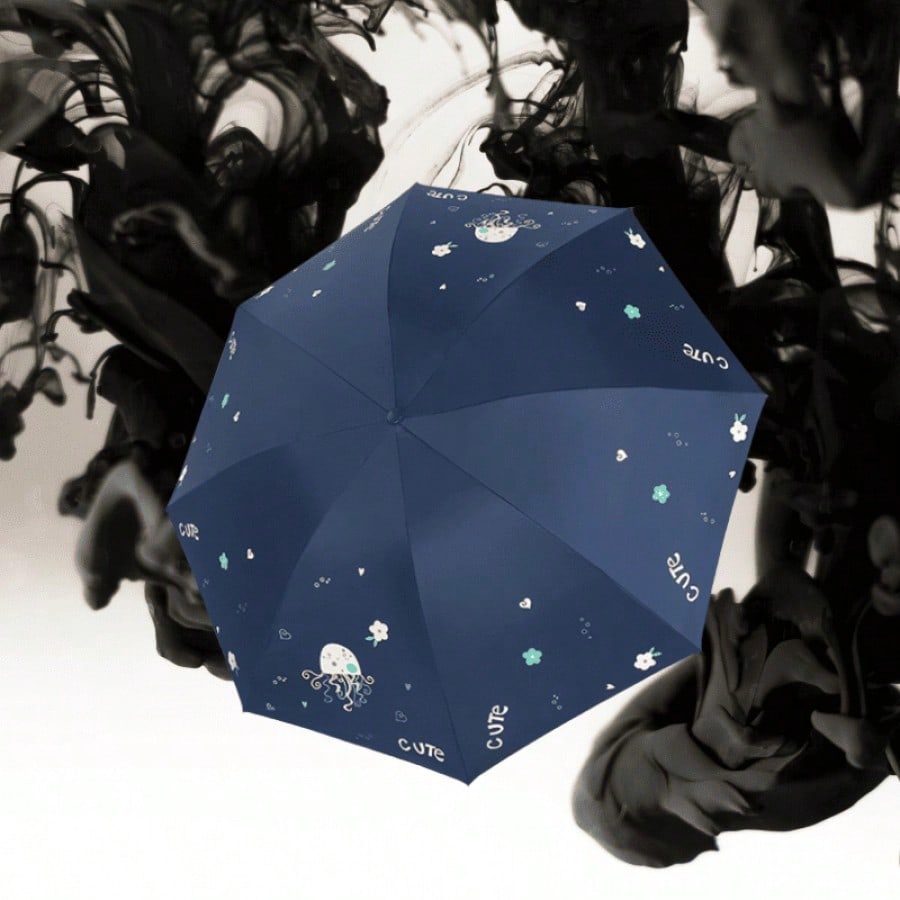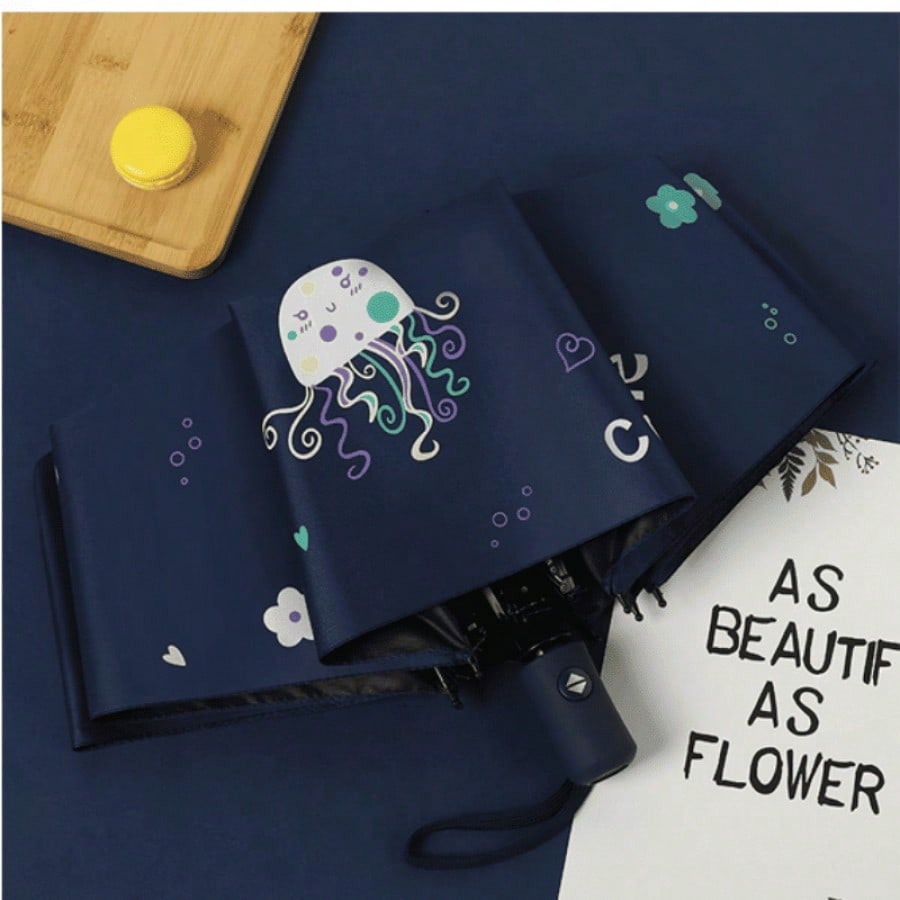 Sumérgete en la profundidad del océano con este paraguas estampado con medusas sobre un fondo azul marino. Su mecanismo automático y diseño de 3 pliegues lo hacen funcional y con un estilo artístico ideal para destacar con elegancia.