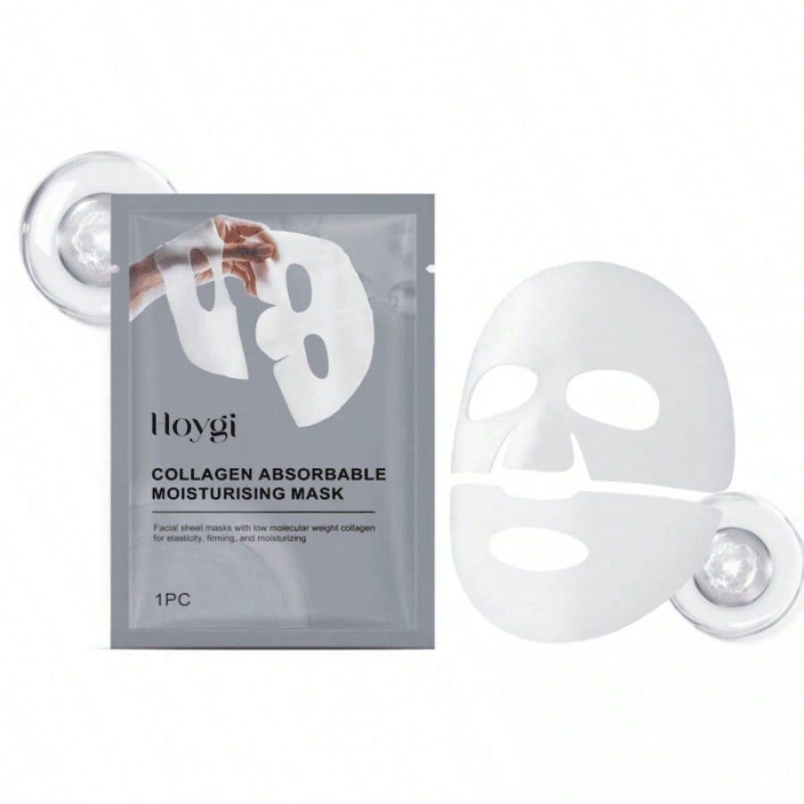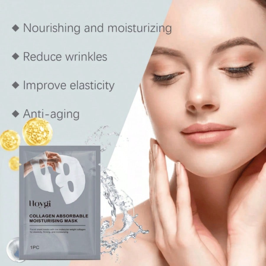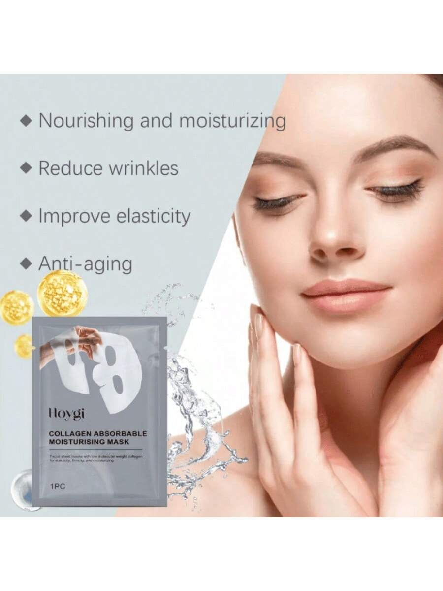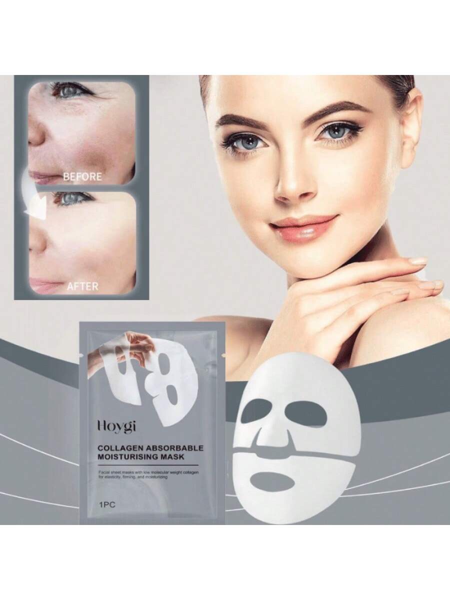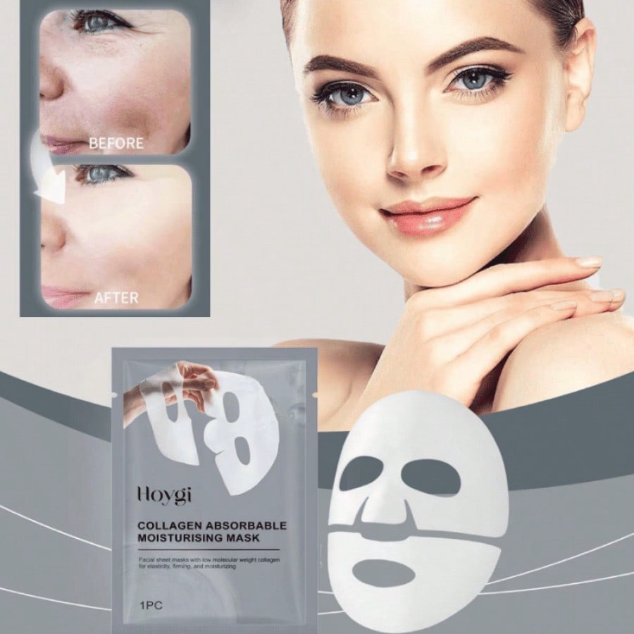 Mascarilla facial intensiva con colágeno, presentada en una práctica caja. Formulada para reducir visiblemente las arrugas y líneas de expresión, devuelve a la piel su elasticidad y un aspecto más liso y rejuvenecido.