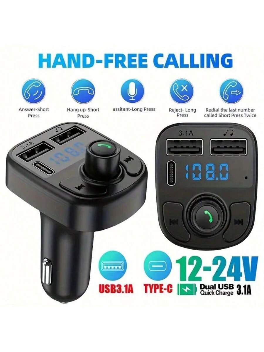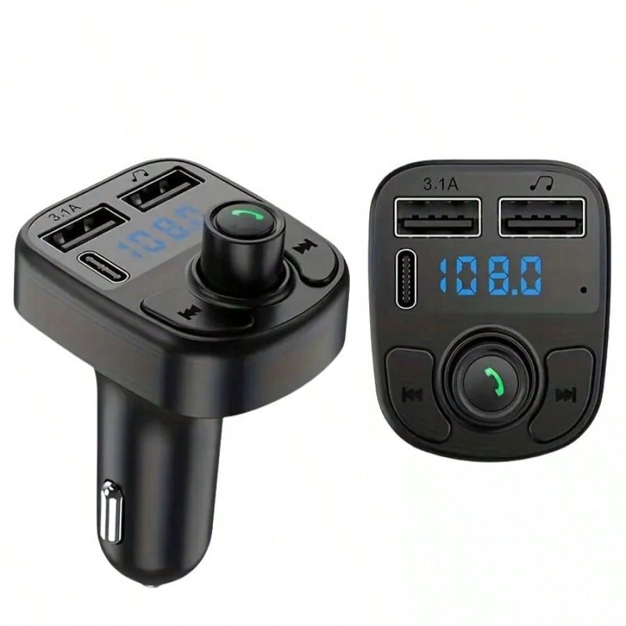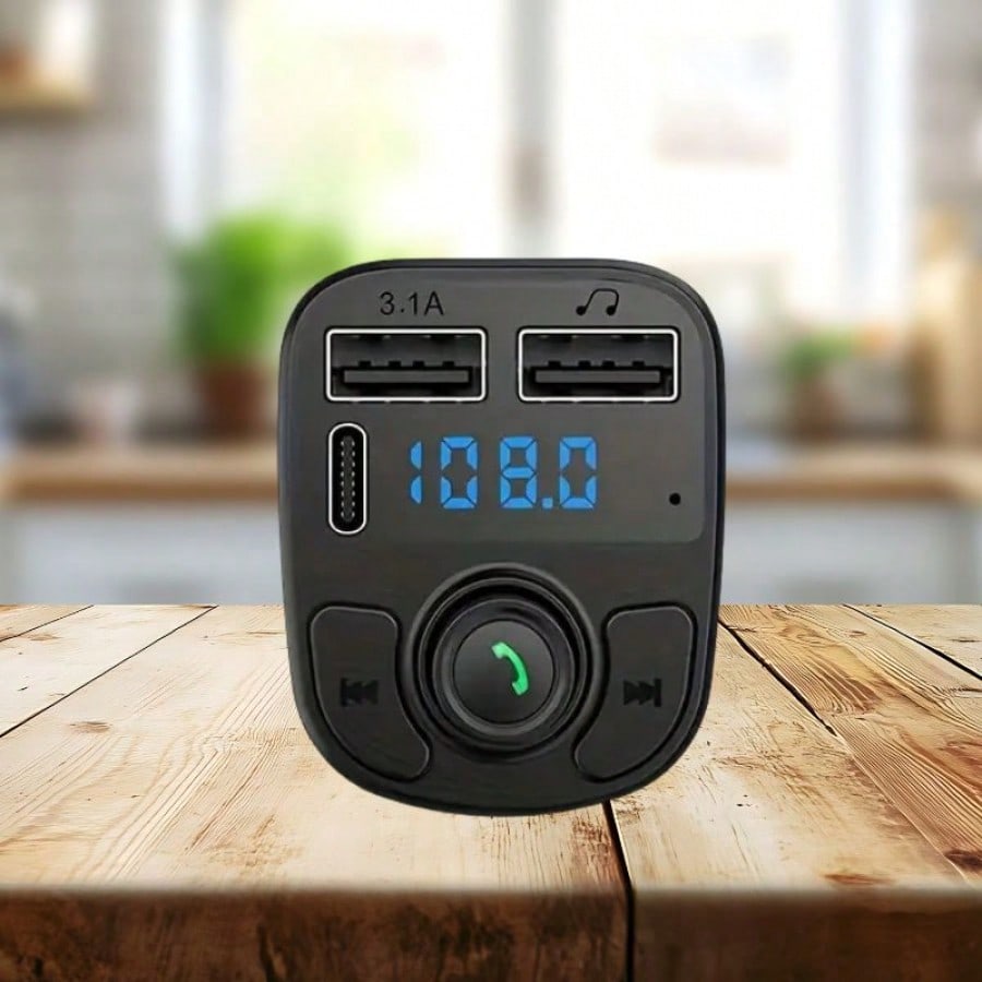 "Moderniza tu vehículo y disfruta de una conducción segura con este Transmisor FM Bluetooth y Reproductor MP3 todo en uno. Su característica principal es el sistema de manos libres (""Hand-Free Calling""), gestionado por un botón central multifunción que permite contestar, colgar, rechazar llamadas o rellamar al último número con simples pulsaciones, además de activar el asistente de voz. El dispositivo es una potente estación de carga compatible con tomas de 12V y 24V, equipada con doble puerto USB (uno de ellos de Carga Rápida 3.1A y otro para lectura de música) y un puerto adicional Tipo-C, permitiendo mantener varios dispositivos con batería simultáneamente. Cuenta con una pantalla digital LED para visualizar la frecuencia FM y botones dedicados para el control de pistas, combinando conectividad y energía en un diseño compacto."