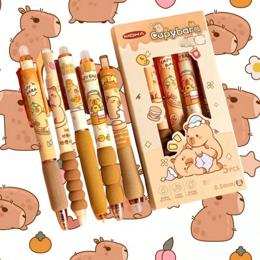 "Lleva la tendencia más relajada y adorable a tu estuche con este paquete de bolígrafos temáticos ""Kapibala"". Este set destaca por su diseño exterior en un cálido color marrón, que evoca fielmente la apariencia natural del carismático capibara, convirtiendo una herramienta simple en un accesorio de papelería encantador y lleno de personalidad. El paquete incluye 5 unidades idénticas, ideales para asegurar que nunca te falte con qué escribir o para compartir con amigos. A pesar de su estética divertida y coleccionable ""kawaii"", estas plumas son altamente funcionales: están cargadas con recambios de tinta negra, proporcionando una escritura fluida, nítida y profesional, perfecta para tomar apuntes en clase, firmar documentos o llenar tu agenda diaria con estilo."
